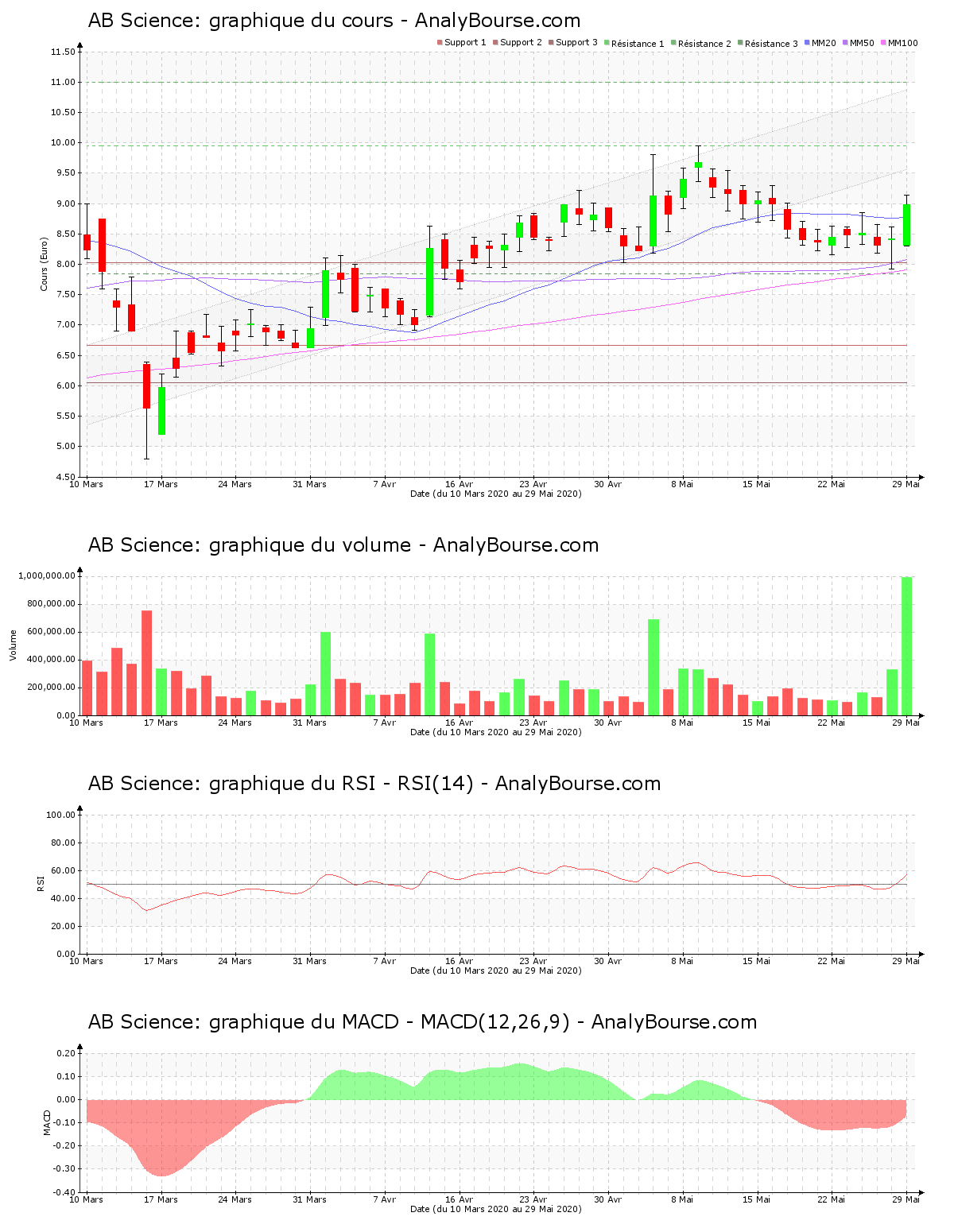 En ce qui concerne les indicateurs, la valeur AB Science possède une moyenne mobile sur 20 jours située au-delà de sa moyenne mobile sur 50 jours, qui est elle-même située au-dessus de sa moyenne mobile sur 100 jours. Sur une longue période, l’action dévoile donc un comportement haussier. Le RSI est ces derniers jours en progression. C’est finalement dans le niveau d’achat que ce dernier se place. On remarque que le MACD est en importante progression ces derniers jours. C’est cependant encore une tendance du cours en grande décroissance que ce dernier suggère à moyen-court terme.