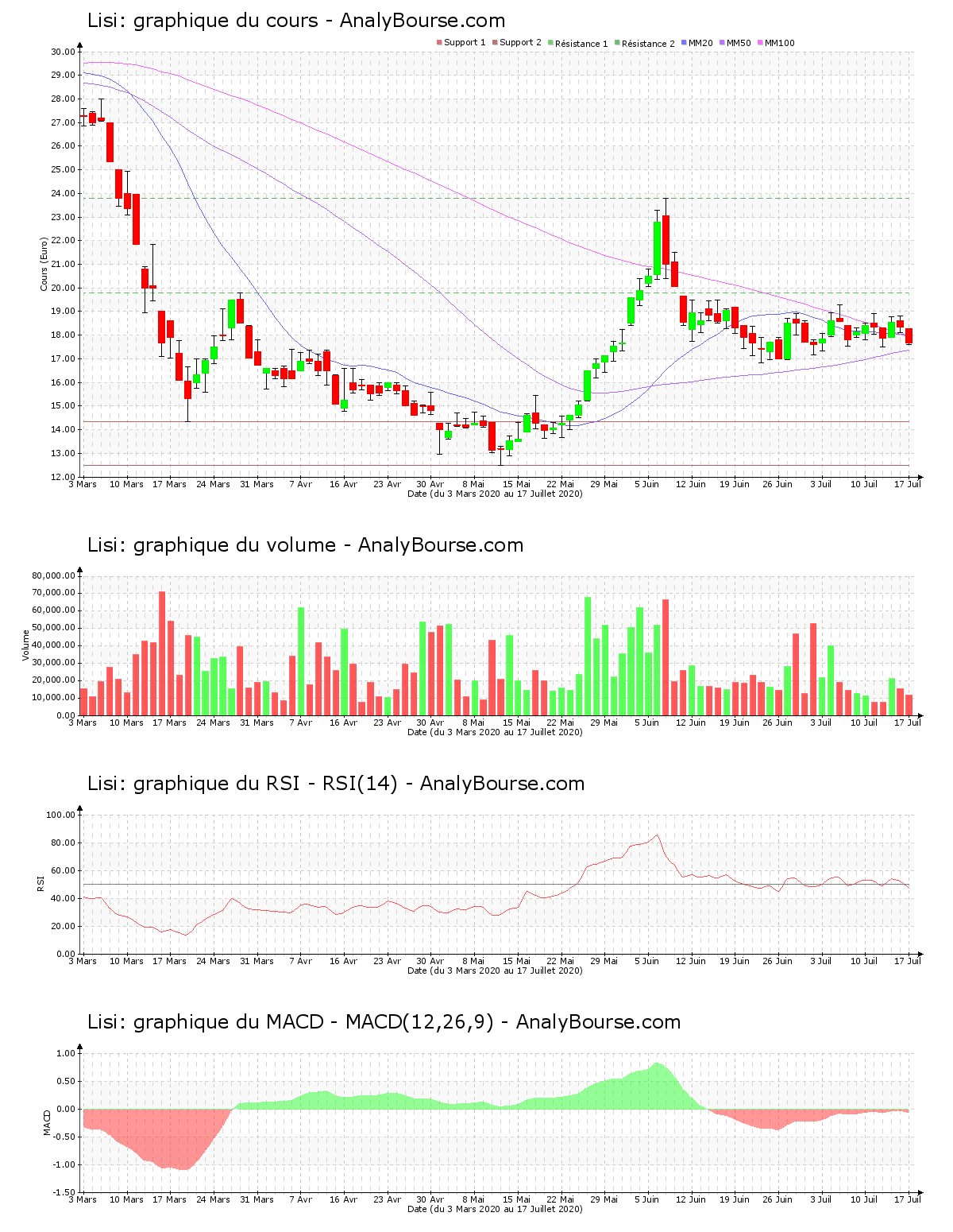 Lisi est en substantielle décroissance ces cinq dernières séances, avec un mouvement baissier de 4.02%. L’action cote maintenant à 17.660 €. Avec un cours haussier de 3.14%, Lisi se revalorisait au contraire la semaine dernière. La proportion acheteurs/vendeurs s’inverse ainsi avec force cette semaine. Notons, avec un taux de 8.00% qui sépare ces dernières séances les extremums, une relative volatilité sur Lisi.