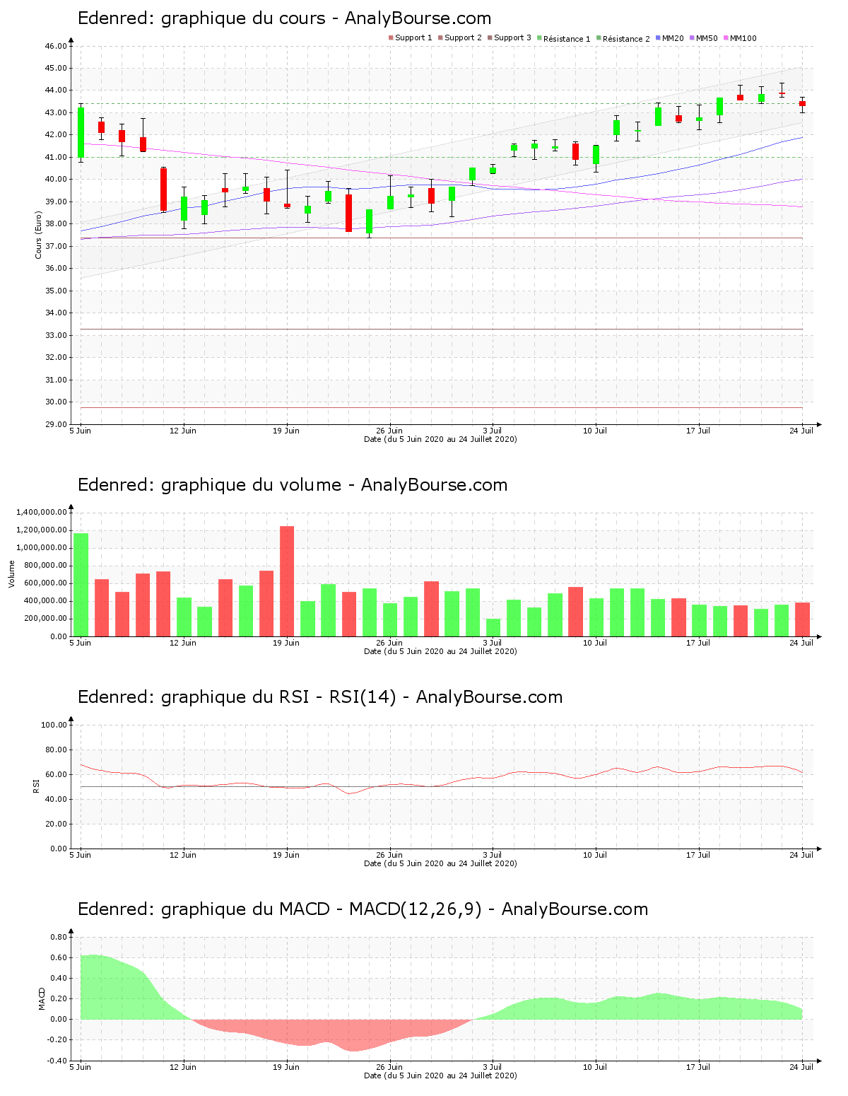 Pour les indicateurs, le RSI est ces cinq dernières séances stable. Il se trouve donc encore dans le niveau d’achat. Pour sa part, la moyenne mobile sur 20 jours de la valeur Edenred est positionnée au-delà de sa moyenne mobile sur 50 jours, qui est quant à elle située au-dessus de sa moyenne mobile sur 100 jours. L’action montre ainsi un développement en augmentation à long terme. Depuis désormais 46 jours de cotations, la moyenne mobile sur 20 jours de l’action Edenred se positionne au-delà de sa moyenne mobile sur 50 jours. Pour terminer, le MACD est en forte régression ces dernières séances. C’est toutefois encore une évolution du cours en conséquente augmentation que ce dernier dessine à moyen-court terme.