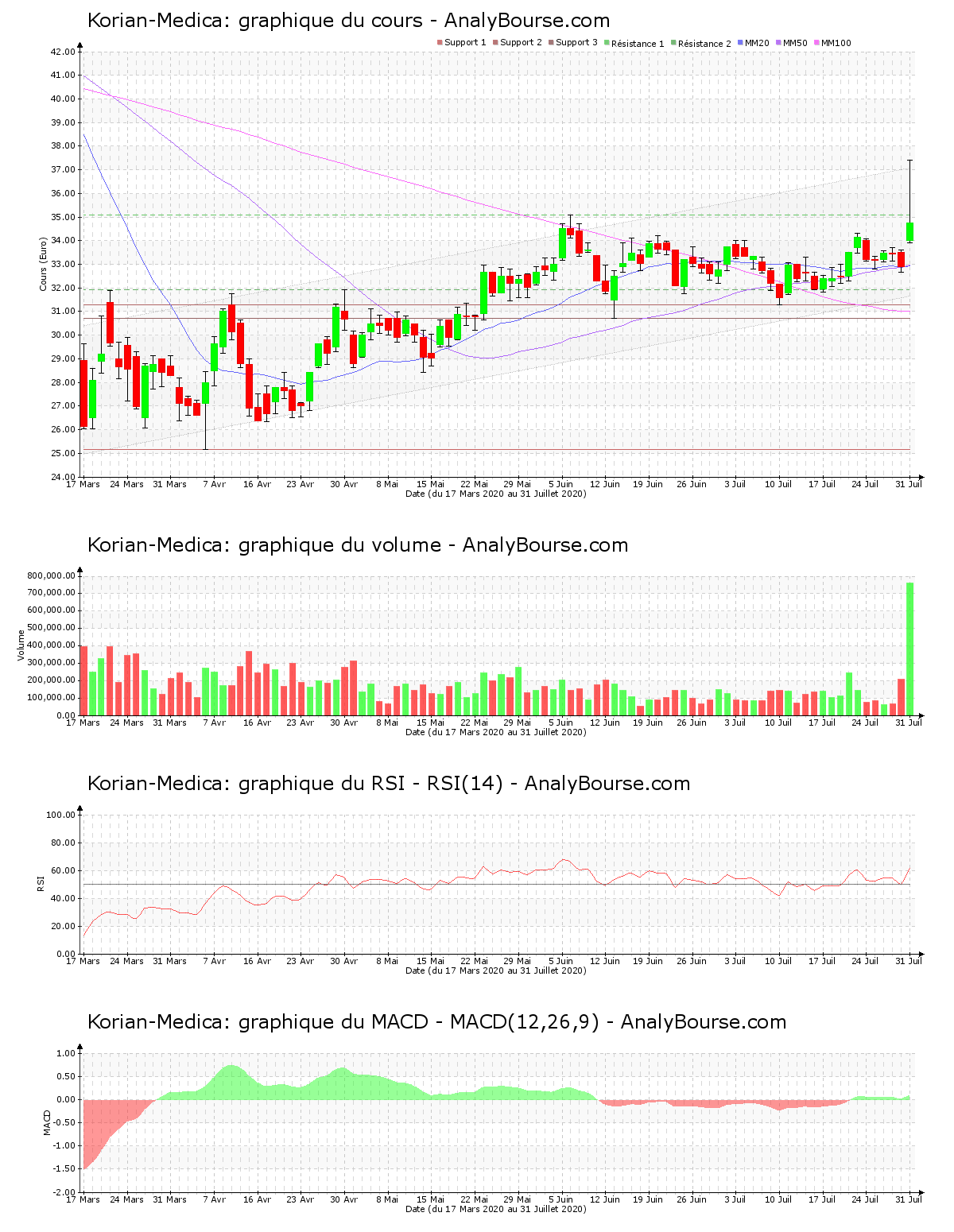 Le volume se trouve bien au-delà de sa moyenne mensuelle, qui est de sensiblement 117000 actions échangées par séance. En effet, le volume est en hausse ces cinq derniers jours de cotations pour l’action Korian-Medica, avec une moyenne par jour de 236000 titres échangés, plus que les 136000 de la semaine dernière. Ce volume en progression indique un regain de la spéculation sur l’action.