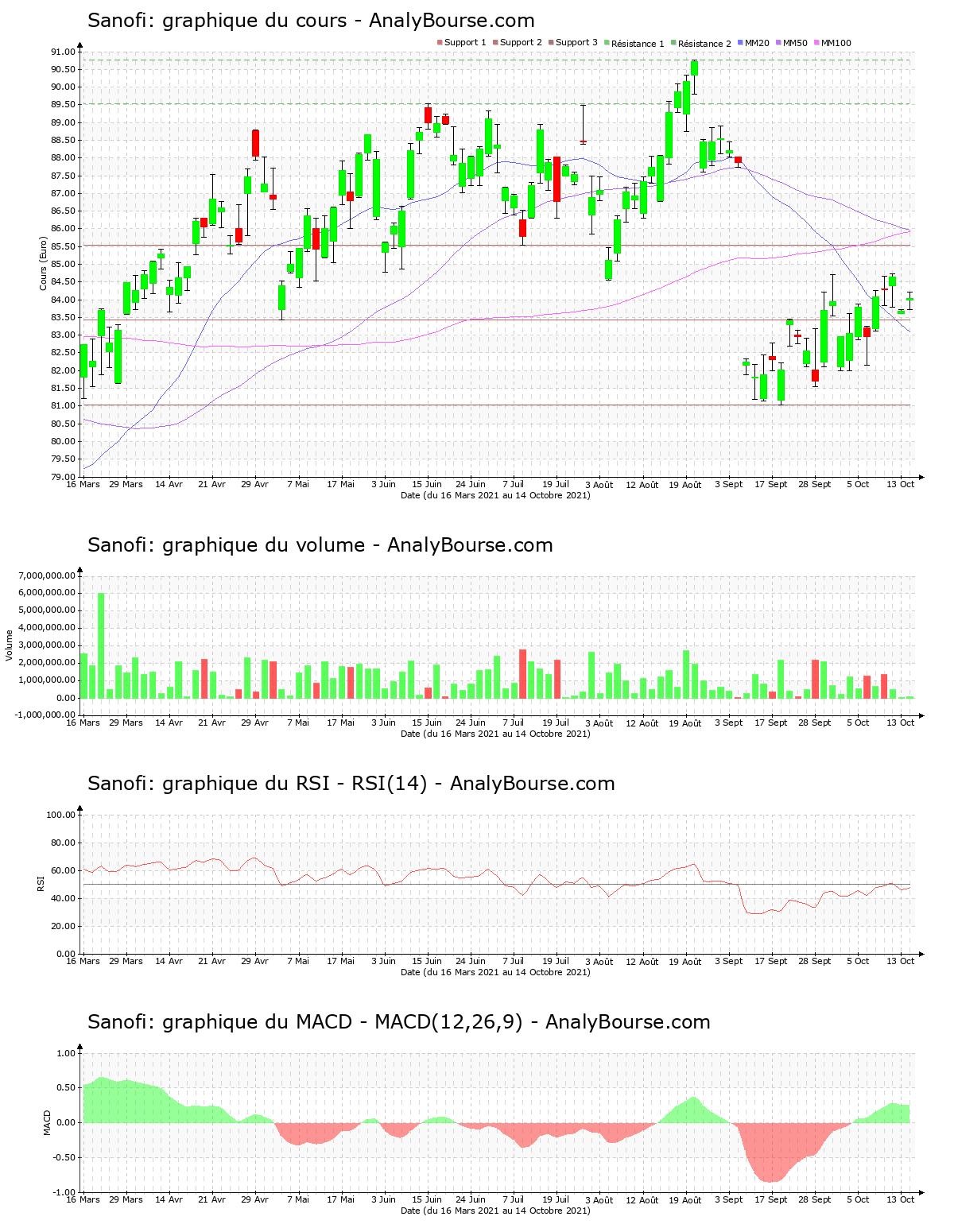 En ce qui concerne les indicateurs, la moyenne mobile sur 50 jours de l’action Sanofi se positionne désormais au-delà de sa moyenne mobile sur 100 jours depuis 69 jours de cotations. Pour sa part, pour le RSI, on repère que ce dernier est assez stable ces dernières séances. C’est ainsi toujours dans le niveau neutre qu’il se place. Pour terminer, on relève que le MACD est en solide progression ces cinq derniers jours. Il montre à présent une évolution du titre en ferme progression à moyen terme.