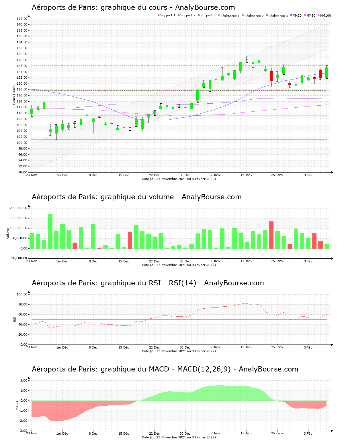 Avec à peu près 22000 titres échangés à 13:45, avec un développement haussier de 2.95%, le bilan est très bénéfique aujourd’hui pour l’action Aéroports de Paris. La valeur explose désormais de 3.600 €, allant de 121.850 € à 125.450 €. Avec un cours haussier de 0.21%, Aéroports de Paris stagnait hier. Le mouvement haussier reprend donc ce mardi 8 février. Aéroports de Paris navigue ce mardi 8 février dans un range de 3.62%, dévoilant une relative agitation sur le titre. Le mouvement du titre l’emmène dorénavant proche de la résistance des 126.100 €.