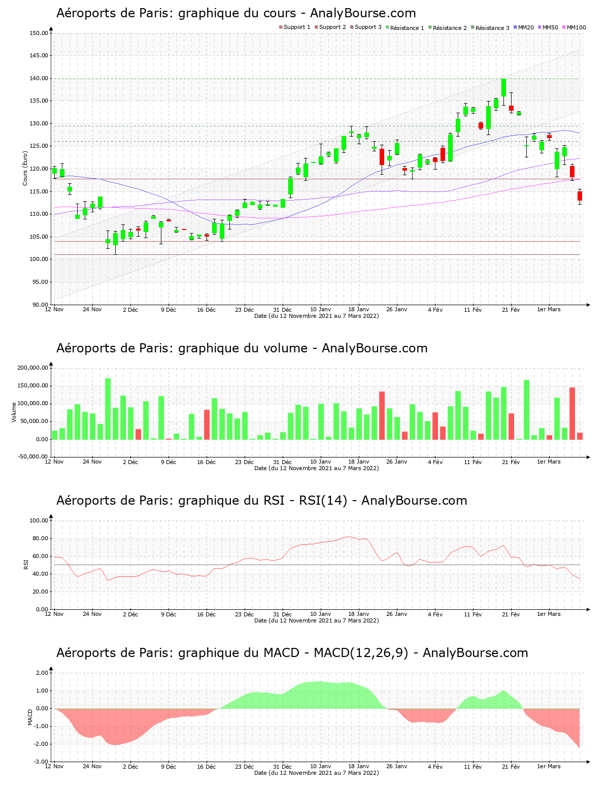 Avec un cours baissier de 4.27%, la valeur Aéroports de Paris est encore en ferme régression aujourd’hui, avec un volume à 09:21 d’à peu près 17000 actions échangées. Avec un comportement en importante régression de 5.25%, cette dernière était déjà vendredi dernier affaiblie. L’action plonge maintenant de 5.050 €, partant de 118.150 € pour se rendre à 113.100 €. Il s’agit de la première fois depuis pas moins de 39 jours que la valeur Aéroports de Paris dépasse ce seuil. Le cours a dépassé le support des 117.750 € ce lundi 7 mars. Le prochain support se situe à 104.000 €.