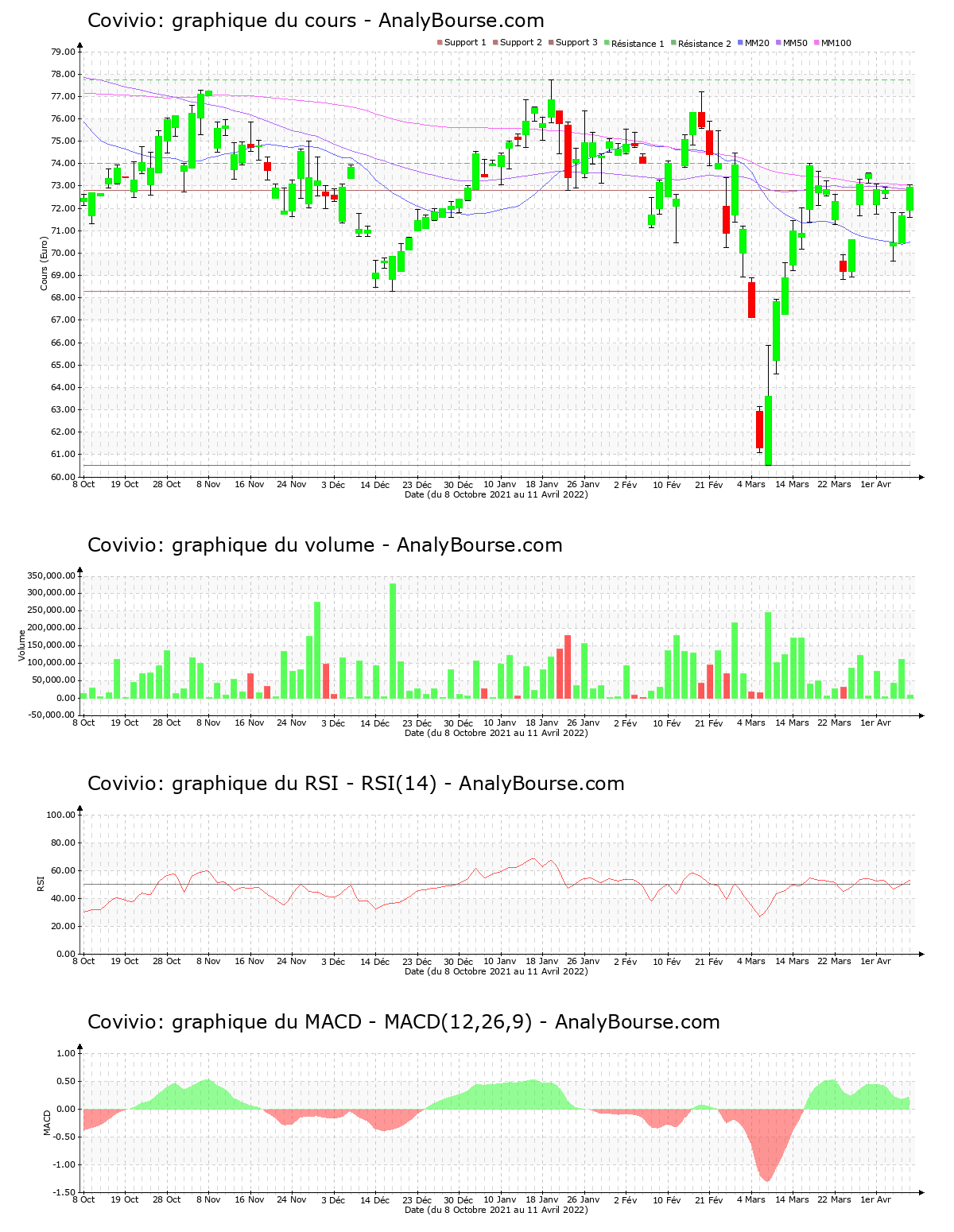 Du côté des indicateurs, on relève qu’aujourd’hui le RSI est en croissance. Il est passé au niveau d’achat, cela pourrait esquisser une base d’une orientation croissante pour l’action Covivio à longue échéance. On remarque que l’indicateur MACD est en augmentation ce lundi. Il révèle dorénavant une trajectoire du cours en importante hausse sur le moyen-court terme.