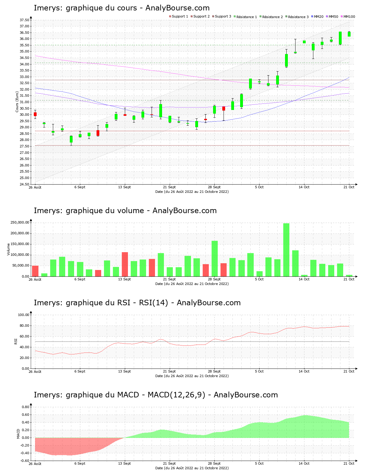 En ce qui concerne les indicateurs, l’indicateur RSI est ces cinq dernières séances plutôt stable. Il se localise par conséquent encore au niveau de surachat. Ensuite, l’indicateur MACD est en solide décroissance ces cinq derniers jours de cotations. C’est malgré tout encore une tendance du cours en solide hausse qu’il révèle sur le moyen-court terme. Enfin, la moyenne mobile sur 50 jours de la valeur Imerys se positionne finalement en deçà de sa moyenne mobile sur 100 jours depuis 87 jours.