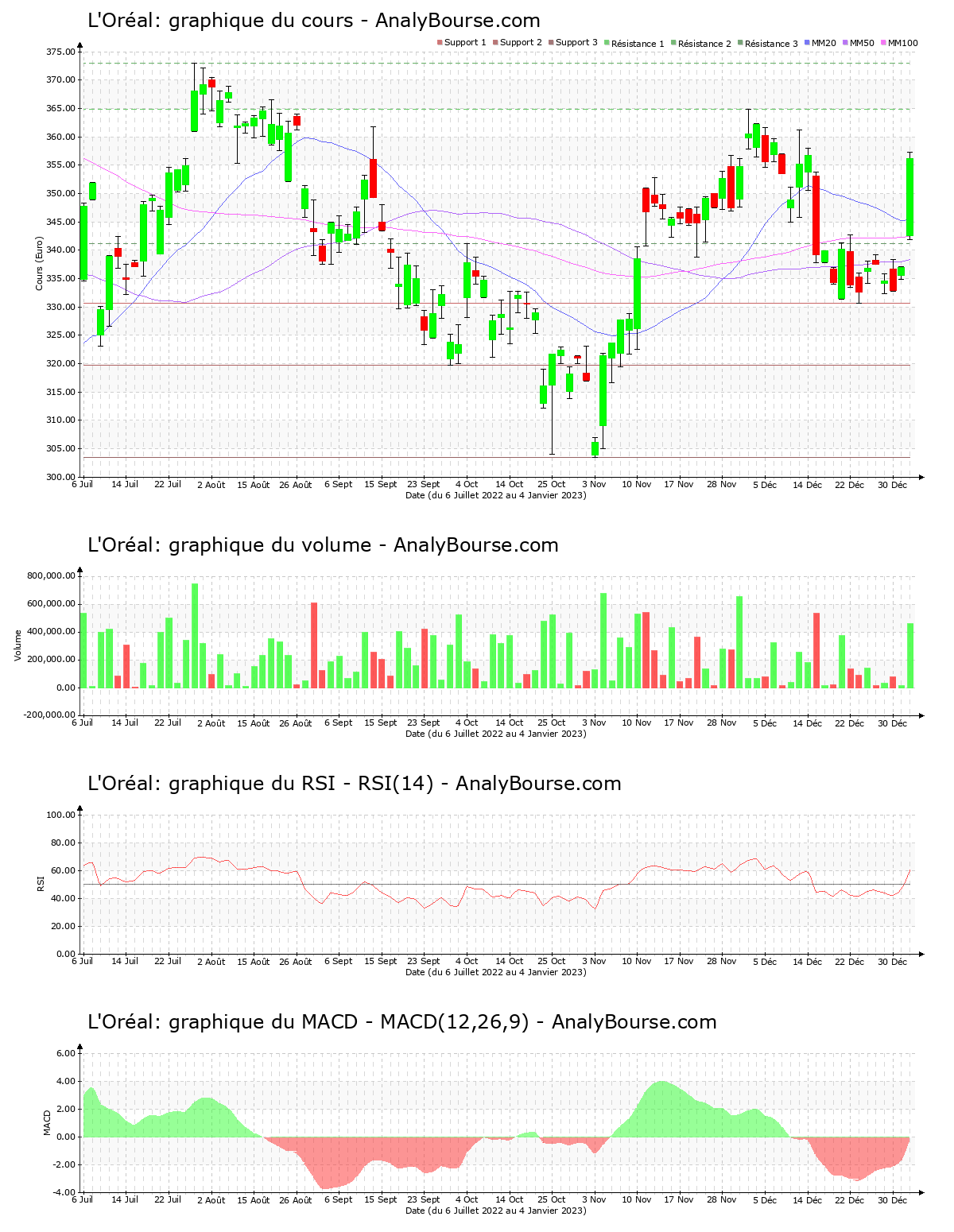Incarnée par un comportement haussier de 5.76%, L’Oréal affiche en cinq jours une substantielle pression acheteuse. Le bilan est de même positif depuis un mois pour le cours, avec un développement haussier de 2.49%. Concrétisée par un comportement baissier de 10.47%, la volonté d’achat sur L’Oréal en un an est néanmoins faible.
