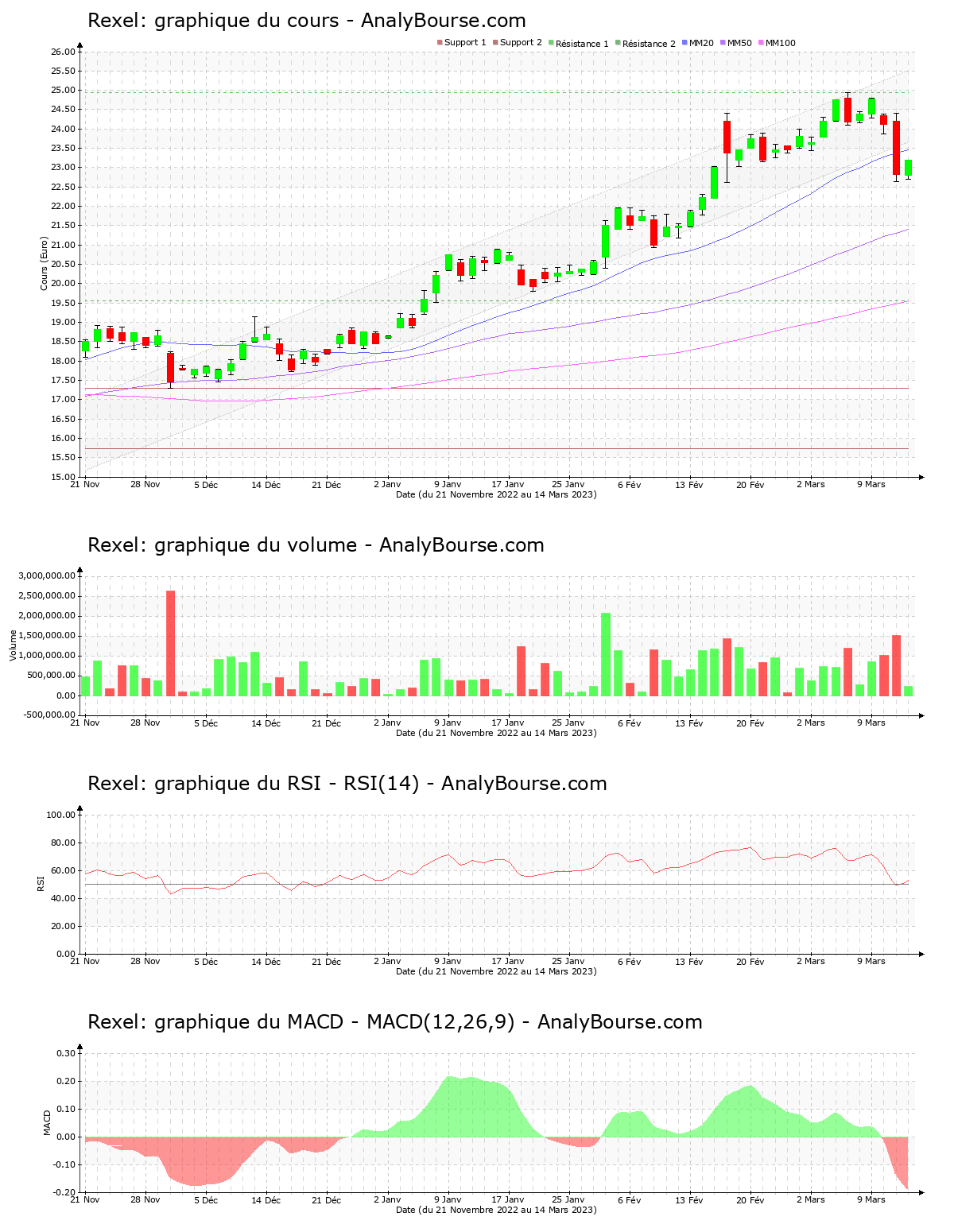 On constate qu’aujourd’hui l’indicateur MACD est en vigoureuse baisse. C’est désormais une tendance du cours en forte décroissance que ce dernier dessine sur le moyen-court terme. On relève que l’indicateur RSI est en progression ce mardi. Il est passé au niveau d’achat, ce qui pourrait dessiner un prémice d’une trajectoire croissante à longue échéance pour l’action Rexel.