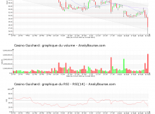 Déplacement ce jour du RSI de la valeur Casino Guichard (FR0000125585 XPAR CO) dans le niveau de vente. Avec approximativement 110000 actions échangées à 09:41, avec un développement